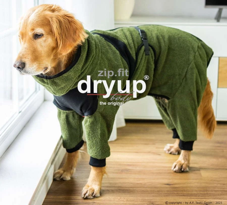 Wenn dein Hund nur leicht schmutzig und nass ist kannst du, auch ohne Duschen oder Baden, ihm einfach den Dryup Body überziehen. Neben der Feuchtigkeit bindet er nämlich auch den Schmutz der sich im Fell befindet. Dieser Schmutz kann dann aus dem trockenen Body einfach ausgeschüttelt werden und liegt deshalb nicht auf dem Boden in deinem Wohnzimmer oder im Auto.