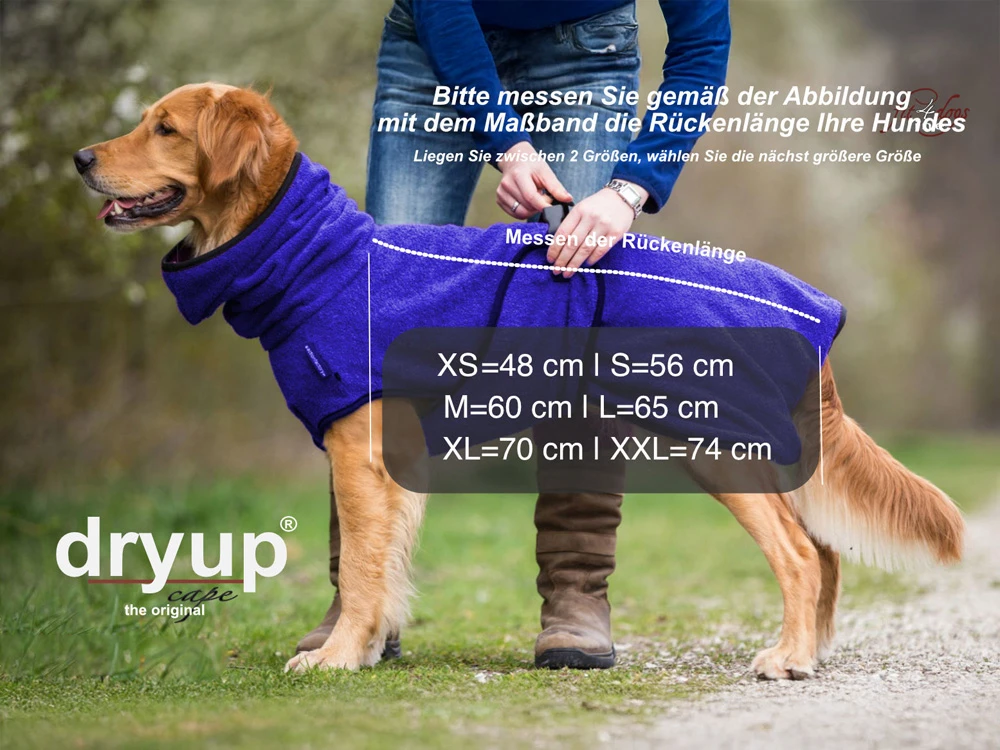 Einfach das Dryup Cape über den Kopf deines Hundes ziehen und dann über den Rücken legen und die Rute durch das dafür vorgesehene Loch am hinteren Ende des Capes ziehen. Anschließend wird die großzügige Bauchabdeckung zwischen den Vorderläufen durchgezogen und mit dem Bauchgurt geschlossen. So trocknet dein Hund angenehm schnell und Schmutz wird im Cape aufgenommen.