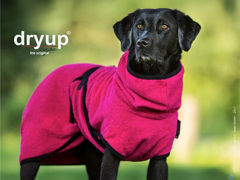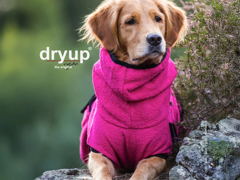 Einfach das Dryup Cape über den Kopf deines Hundes ziehen und dann über den Rücken legen und die Rute durch das dafür vorgesehene Loch am hinteren Ende des Capes ziehen. Anschließend wird die großzügige Bauchabdeckung zwischen den Vorderläufen durchgezogen und mit dem Bauchgurt geschlossen. So trocknet dein Hund angenehm schnell und Schmutz wird im Cape aufgenommen.