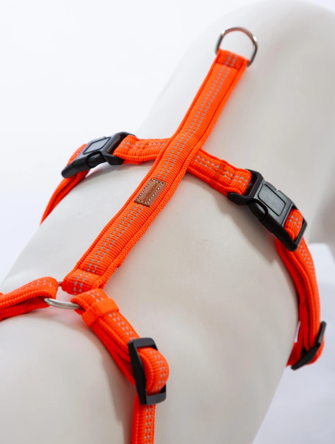 Die gepolsterten und reflektierenden Bänder des Geschirrs in höchster Qualität sind geruchsneutral und langlebig. Die optimale Lage des Bauchgurts garantiert, dass das Geschirr auch unter Zug nicht in den Achseln scheuert. Der Anleinpunkt liegt so weit hinten, dass Dein Hund motiviert nach vorne gehen kann.