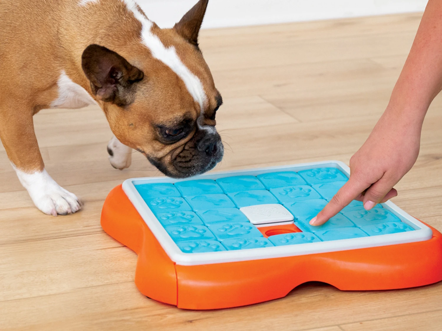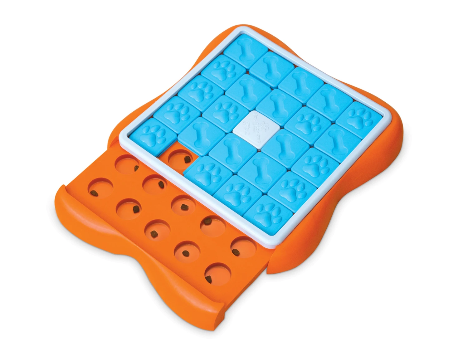 Dein Hund langweilt sich mit einfachen Suchspielen und Intelligenzspielzeugen? Dann ist er bereit für den Challenge Slider. Mit dem Challenge Slider kannst Du deinen Hund geistig herausfordern: Zuerst muss er nämlich herausfinden, unter welchem Schieber das Leckerchen ist und dann muss er auch noch daran kommen.