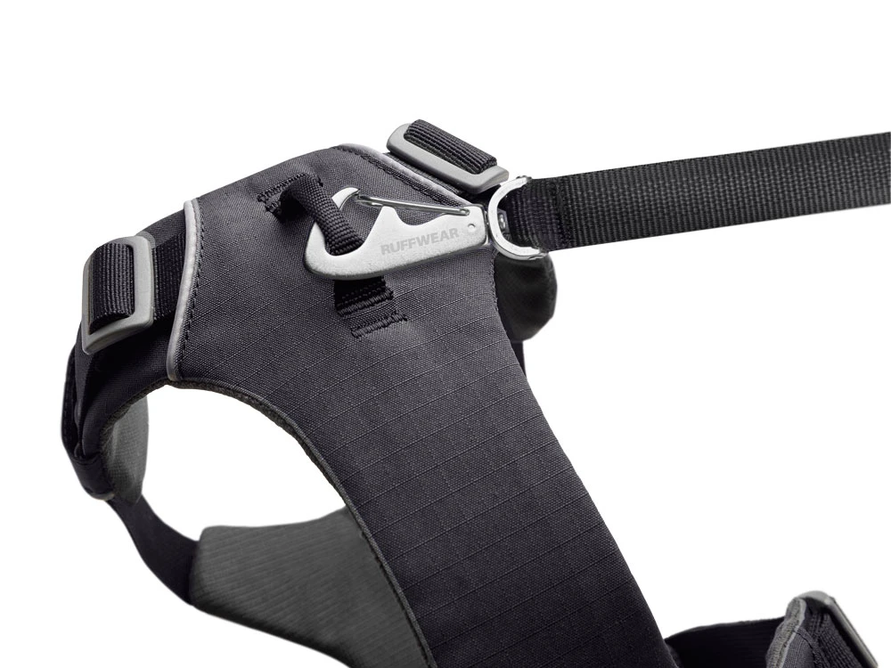 Du kannst deinen Hund mit dem Ruffwear Front Range™ entweder herkömmlich am D-Ring der Rückenplatte anleinen oder am verstärkten Nylongurt im Brustbereich z.B. beim Training.