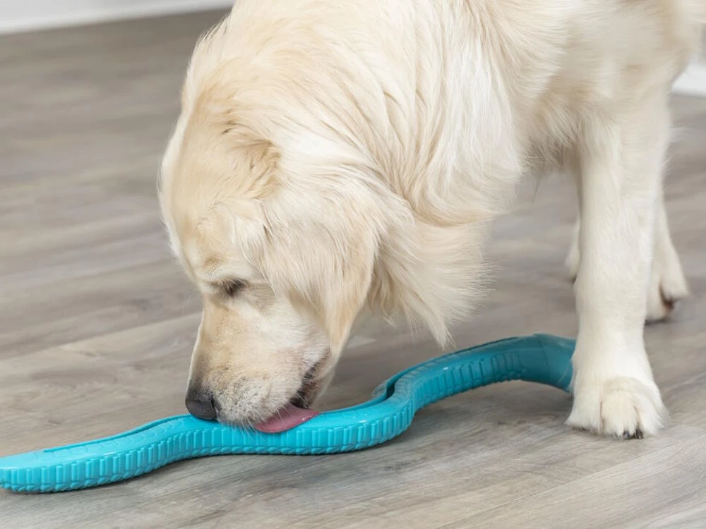 Die Snack Snake wird deinen Hund eine ganze Weile beschäftigen um an die versteckten Leckereien zu kommen.